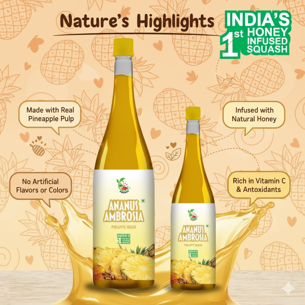 Experience the tropical magic of pineapple with the natural sweetness of honey in Ananas Ambrosia. This unique No Added Sugar Pineapple Squash blends tangy pineapple with smooth honey for a refreshing taste like no other. Whether served chilled or mixed into your favorite mocktail, this Honey-Infused Pineapple Squash is a burst of tropical delight in every sip. Available in 750 ml bottles, it’s the ultimate thirst-quencher for every occasion.
